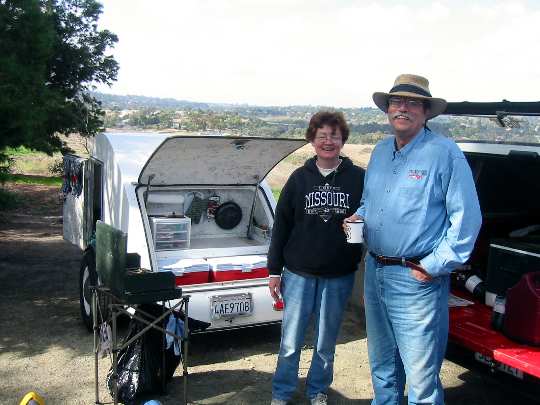 Robert & Rose Marie in their fiberglass "Snoozer" or perhaps "Long" trailer.
